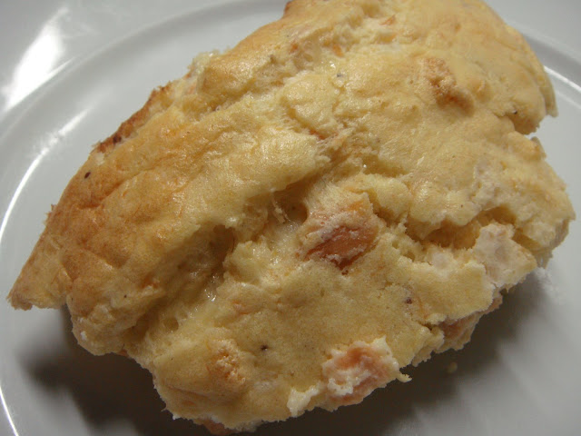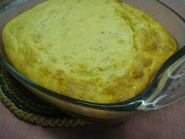 Refoguei muito levemente, em azeite e 2 colheres de sopa de margarina, 1 chalota e 1 dente de alho. Juntei 4 colheres de sopa de farinha e 1 e ½ chávena de leite para preparar uma espécie de bechamel. A seguir, já fora do fogão, adicionei 2 lombos de salmão, ligeiramente cozidos no microondas e esmagados com um garfo, 1 porção de queijo ralado e 4 gemas de ovos, tudo temperado com sal, pimenta branca e 1 colher de chá de mostarda “à antiga”. De seguida, bati em castelo 4 claras na minha linda batedeira nova e envolvi-as com a mistura anterior. Foi ao forno pré-aquecido a 175 ºC, durante 40 minutos.