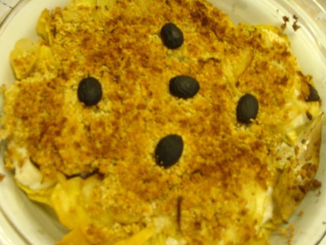 E assim fiz: temperei lombos de pescada com sal, pimenta branca, alho em pó e limão, e fritei-os quase nada numa frigideira apenas untada com óleo. Forrei uma assadeira com batata frita DE PACOTE (que vergonha, que vergonha!), dispus a pescada por cima e reguei-a com um refogado de cebola às rodelas, azeite, alho, louro e mais pimenta branca. Cobri com broa caseira ralada com salsa e 2 dentes de alho, uns fiozinhos de azeite por cima, umas azeitonas pretas só para coiso, e forno quente!