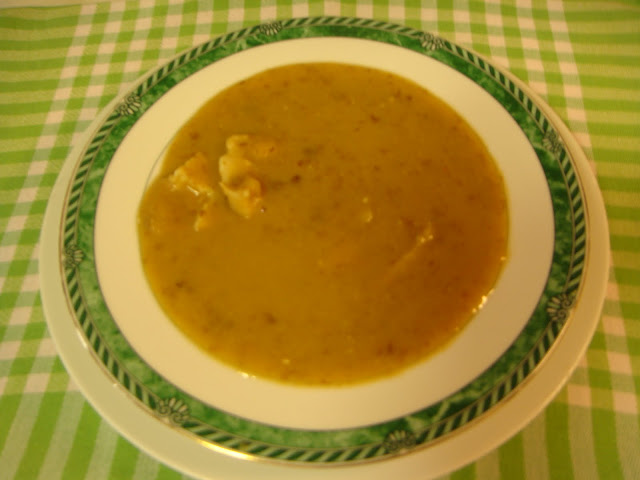 Ficou tão boa! Preparei-a com batatas, cebola e alho, ligeiramente refogados em azeite, cenoura, alho francês, 1 frasco médio de lentilhas cozidas e 3 filetes de pescada, um cozido juntamente com os outros ingredientes e os outros dois a vapor, num coador grande apoiado na panela (truque aprendido com a minha sogra), para desfiar depois de passada a sopa. Temperei com sal, coentros moídos e uma boa porção de pimenta branca. Uma delícia!
