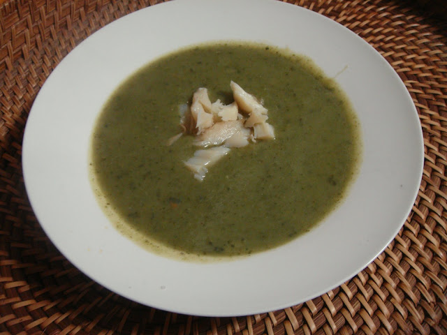 Batata, couve e grelos, tudo já cozido, sobre um refogado de azeite, cebola e alho, mais umas cenouras. Água a ferver em cima, cozeu uns 15 minutos, e foi só passar com a varinha e guarnecer com lascas de bacalhau ;)