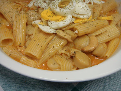 Quando a massa estava cozida, já quase sem água, juntei uma porção de queijo ralado e envolvi bem no molho. Já na travessa, ovos cozidos às rodelas e orégãos por cima. Muito bom!
