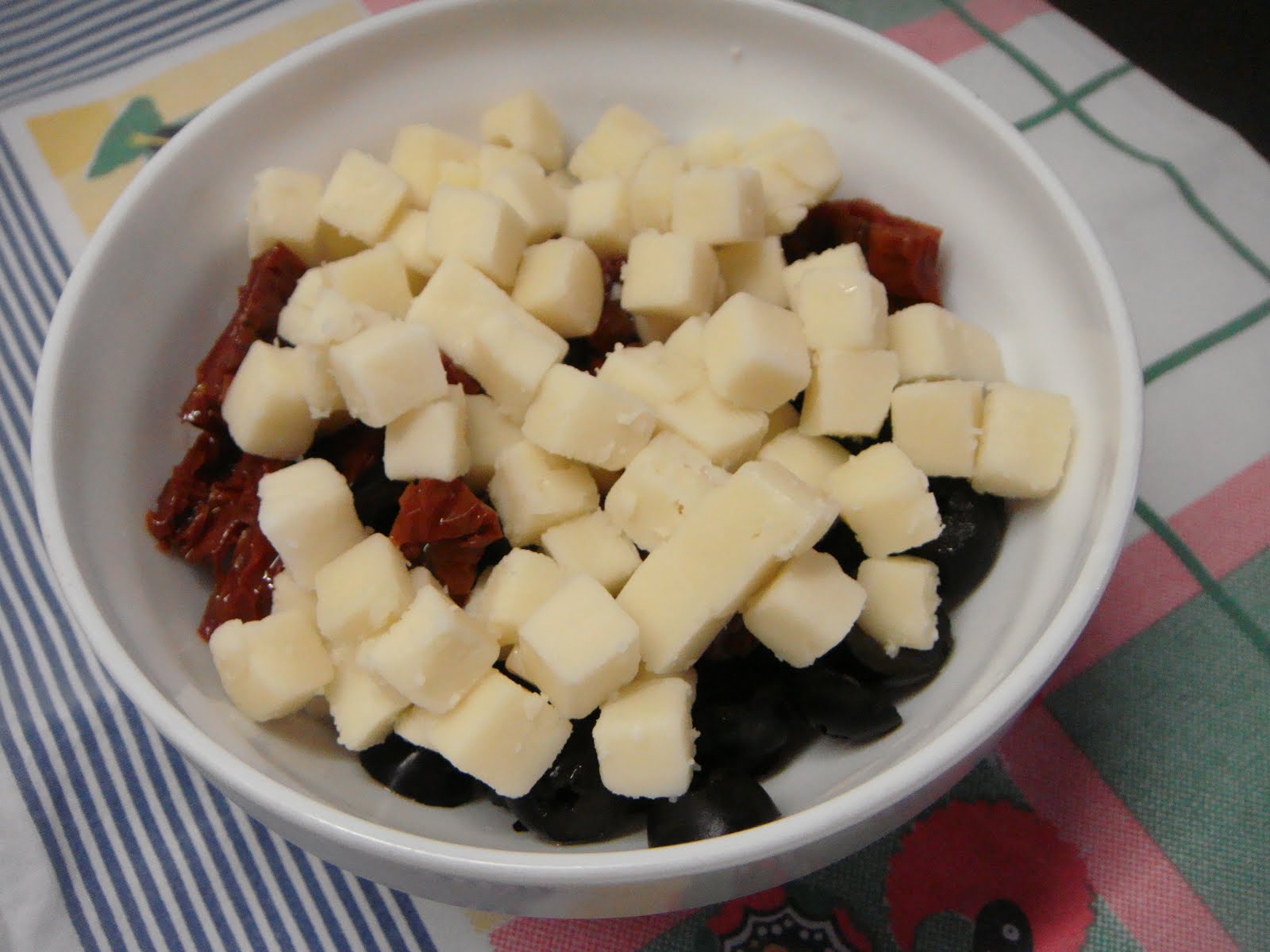 El pan levou 500 g de farinha para pão rústico, 330 ml de água, de acordo com as instruções da embalagem, meio frasco de azeitonas pretas às rodelas, 1 mão cheia de cubos de queijo e meia dúzia de tomates secos cortados às tiras, estes três ingredientes colocados depois de soar o apito – há que respeitar o apito!
