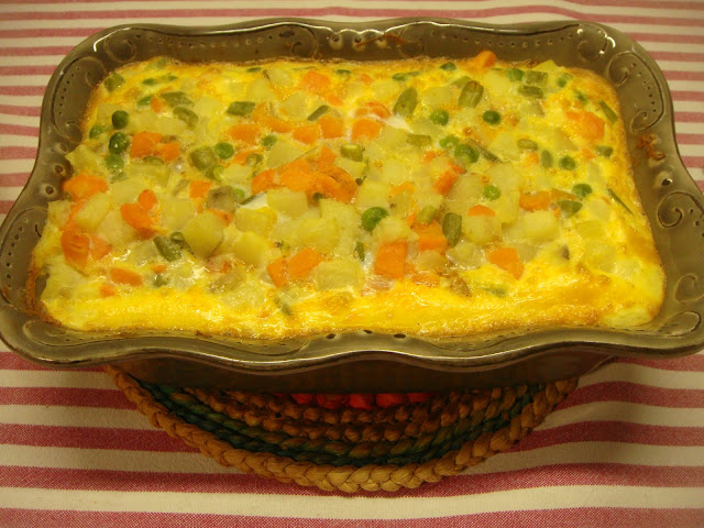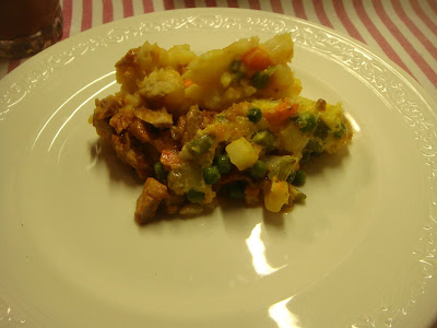 Apreciariam um empadão empadado com sobras de bifes de atum? Saiu bom! Faz-se o puré, nada de pré-preparados, batatinha cozida e esmagada com um pouco de leite e margarina, mais tempero de noz-moscada e pimenta branca. Avançando, desfia-se ligeiramente, que não gosto de grandes desfiados, os bifes de atum que aterram numa frigideira com margarina derretida e alho picado. Ferve ali um bocadinho que até dá gosto, junta-se pouca polpa de tomate frito e mais pimenta branca. Na assadeira, uma camada única de puré, o atum acamado em cima, nova camada de jardineira de legumes que também sobraram de uma maionese de pescada (do género desta) e 2 ovos batidos a encobrir. Forno quentinho até acharem que chega.