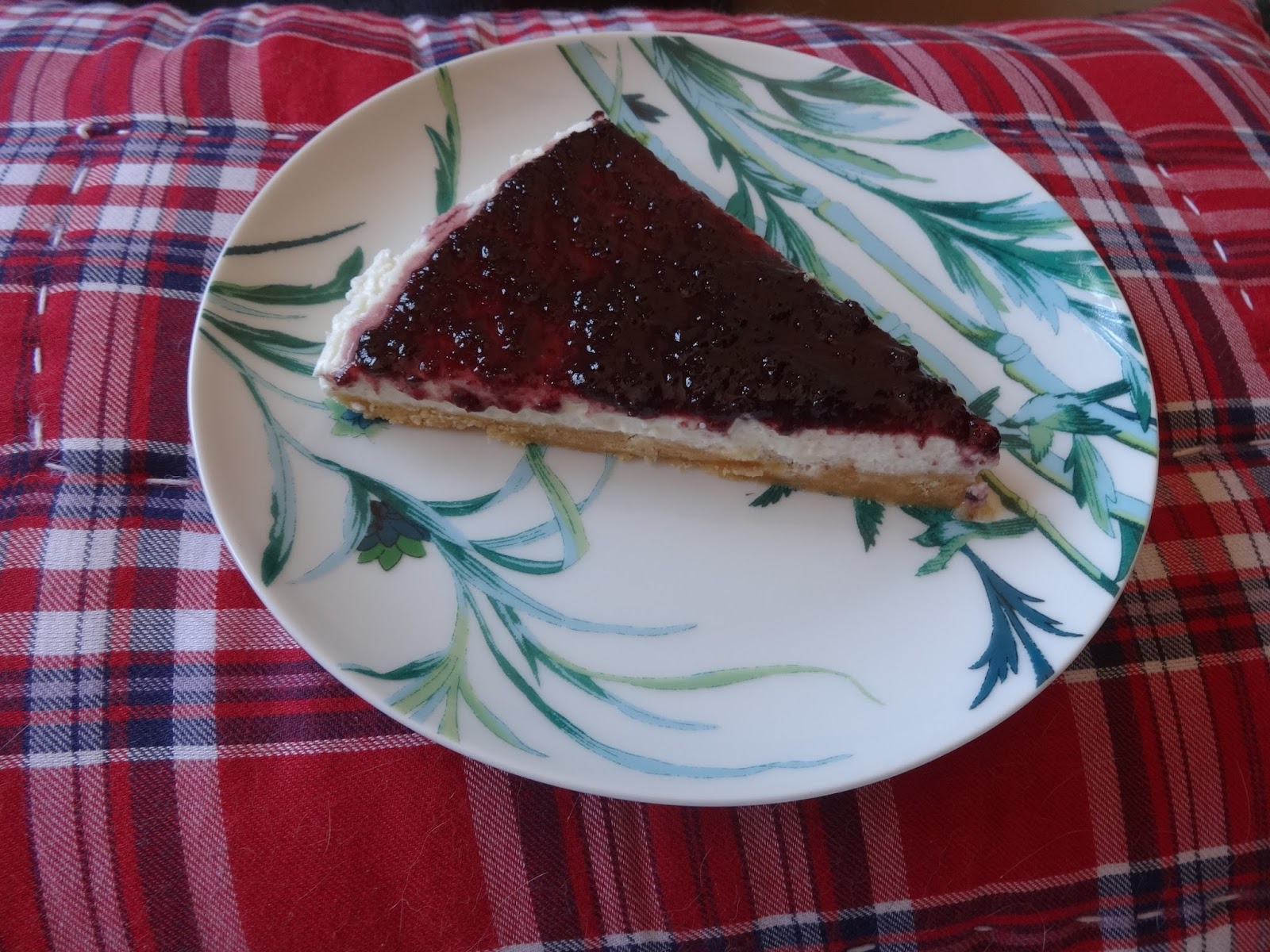 Aplica-se a base no fundo de uma tarteira com aro amovível, comprimindo bem, creme de queijo e natas por cima, e coloca-se primeiro no congelador e depois no frigorífico, de preferência de um dia para o outro. Estando durinho, cobre-se com uma camadinha de doce de mirtilos e está pronto a servir!